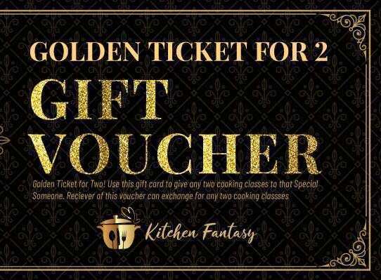 Golden Ticket for Two! Use this gift card to give any two cooking classes to that Special Someone. Receiver of this card can exchange for any two cooking classes at Kitchen Fantasy cooking school.